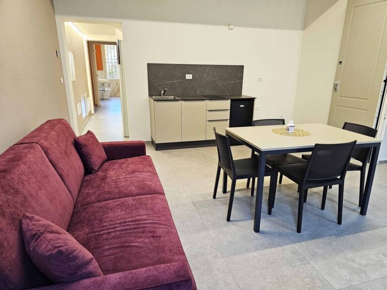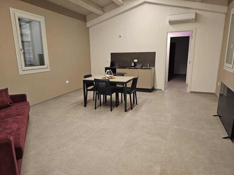 Appartamento spazioso al piano terra, ideale per coppie o famiglie fino a quattro persone, con angolo cottura attrezzato e tutti i comfort per un soggiorno rilassante a Palazzo Glicine.