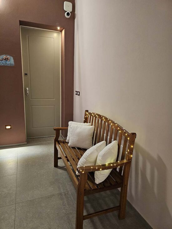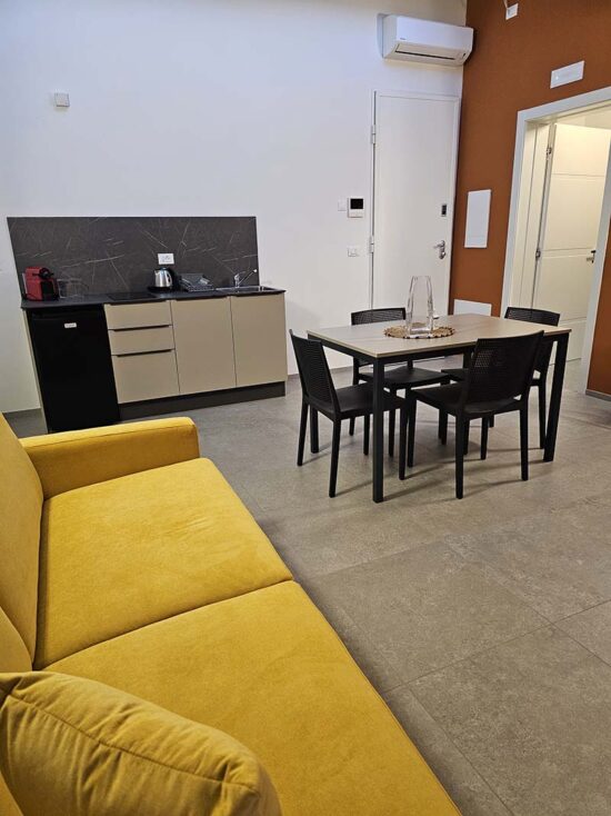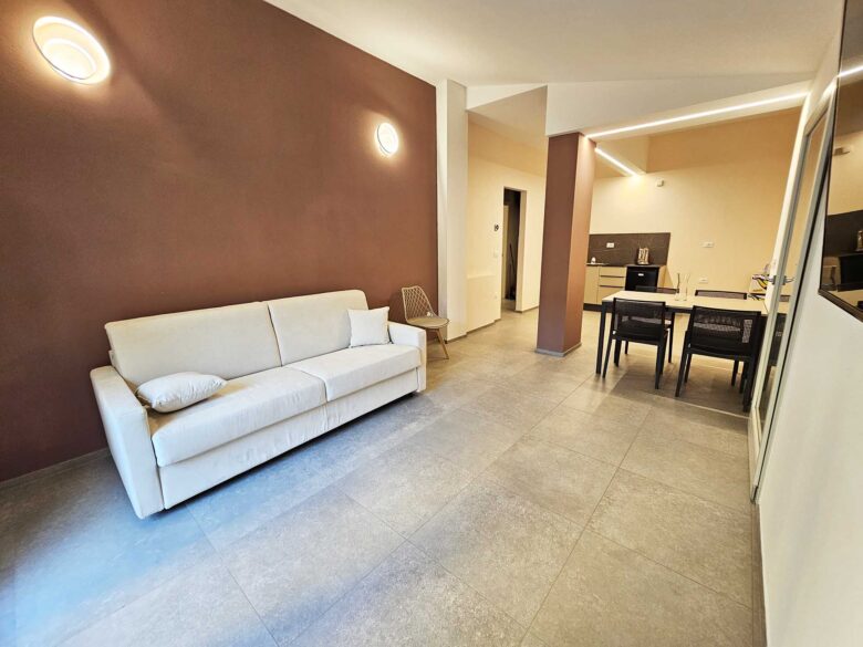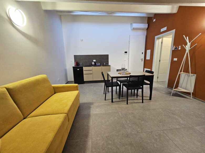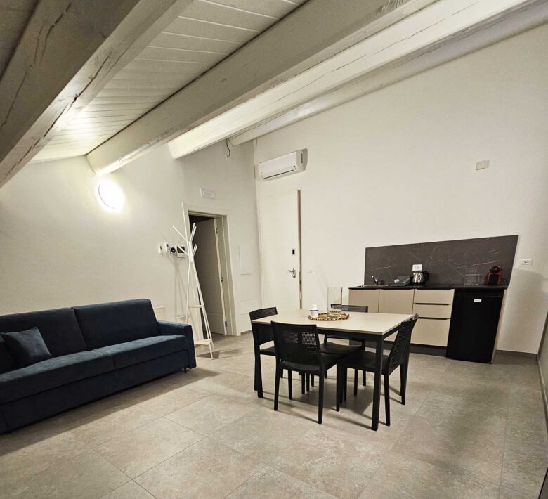 Appartamento al secondo piano, ideale per coppie o famiglie fino a quattro persone. Zona giorno con divano letto, camera matrimoniale, angolo cottura attrezzato e tutti i comfort per un soggiorno sereno a Palazzo Glicine.