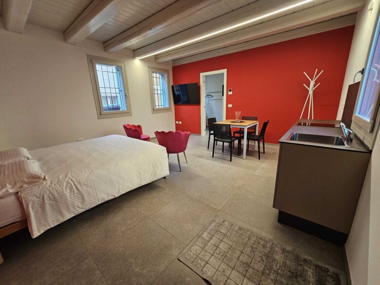Monolocale al piano terra a Cotignola, con accesso dalla corte interna e vista sul giardino, ideale per due persone. Ambiente unico con letto matrimoniale, zona soggiorno con TV, angolo cottura attrezzato e tutti i comfort per un soggiorno rilassante a Palazzo Glicine.
